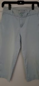 Powder blue pants, very cute button accents bottom of each leg. Low slung, 2" waistband, front and back pockets, 5 belt loops, button and zipper closure. Cotton/spandex blend. BRAND LABEL MISSING, but great pants!