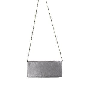 Pale silver-grey formal clutch with rhinestone embellishment and a fold-in chain strap. Can be worn on the shoulder or as a clutch. Great for weddings, proms, or formal events.