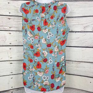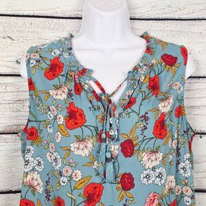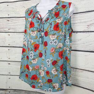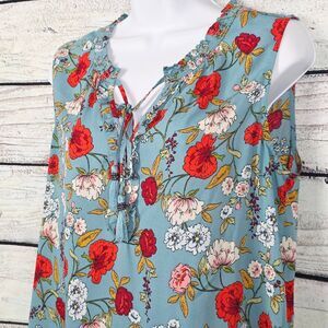 Pale Sky women’s sleeveless blouse, size Medium. Light blue with vibrant red, pink, and yellow floral print. Smocked neckline with front tassel tie. 100% polyester, made in China. Lightweight and perfect for spring or summer.