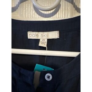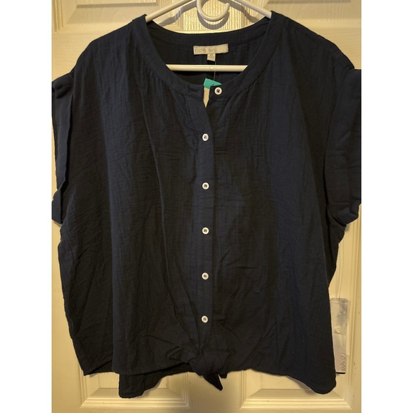 Pale Sky Navy Blue Textured Button Front Tie Waist Top Plus Size 2X 1471