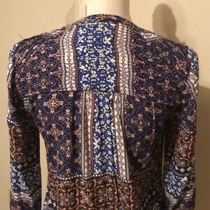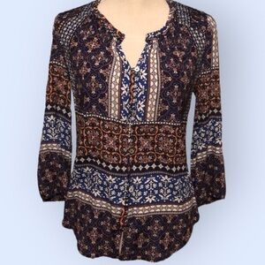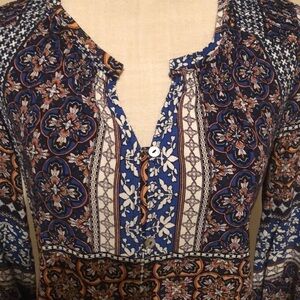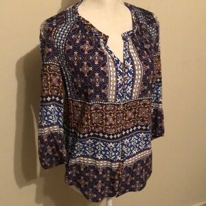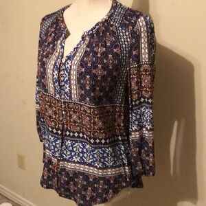 Pale Sky peasant style blouse with multi patterns in blues, browns . Vee style neck with small buttons down front. Yoke in back has unique horizontal tiny pleats. 3/4 sleeves. Nwot