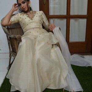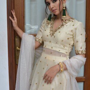 Composition / Material: Shimmer organza in off white color. Hand embroidered with golden sequins , cut dana work.