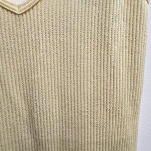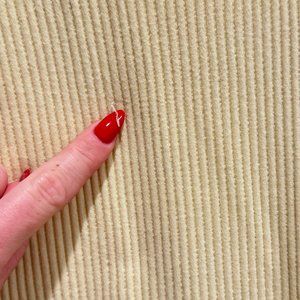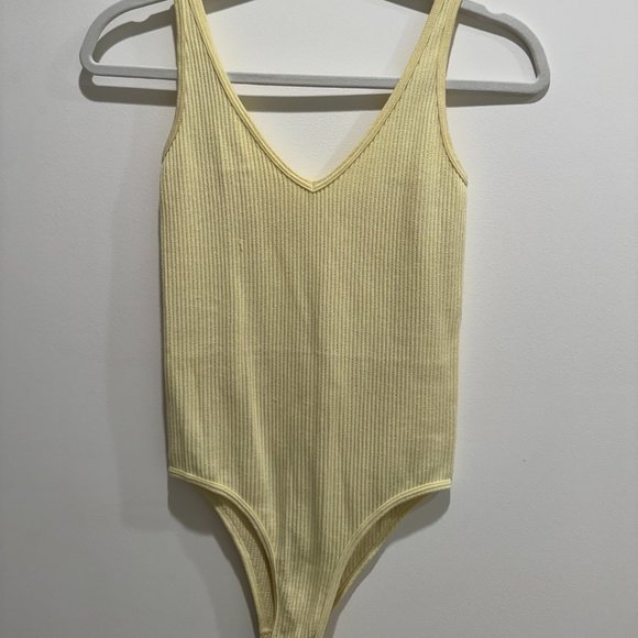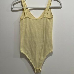 Pale yellow ribbed bodysuit. Has a loose thread on the front of the bodysuit.