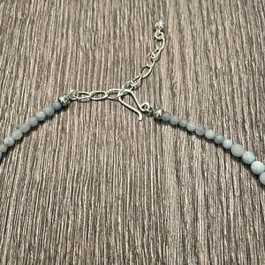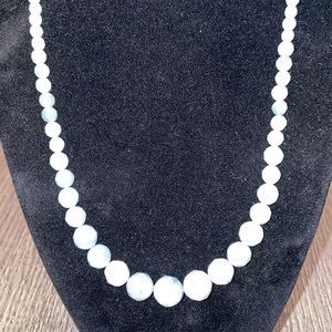 Pale blue necklace. Beads start small at closure and gradually get bigger to midpoint on front of necklace. Adjustable length hook closure. In excellent condition.