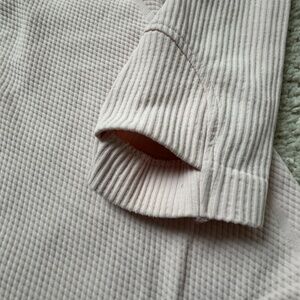 Pale pink Athleta ribbed long sleeve top. Turtleneck style, slim fit to be worn underneath. Long sleeves with thumb holes.Stretchy