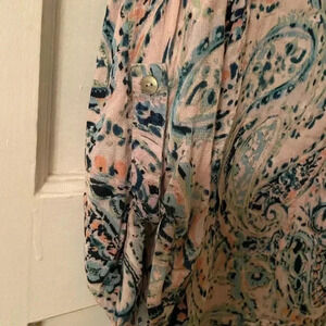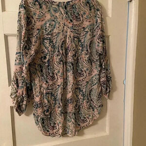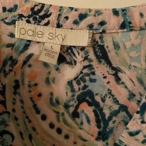 Great pre-owned condition Pale Sky large blouse. This blouse has 3/4 sleeve that buttons and is different shades of pink and blue.