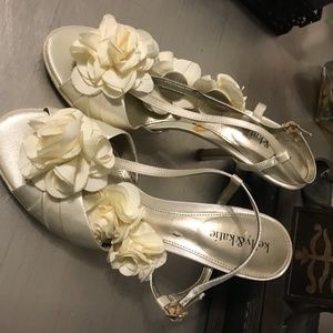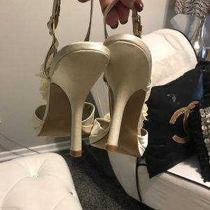 These are new, never worn. They have been sitting in my closet. There is a glue spot on inside of one shoe, but your foot covers it when worn. Very sexy shoe. I just never had the right outfit to wear them with.