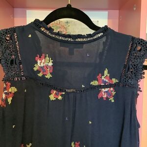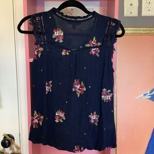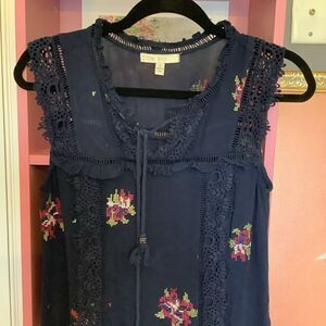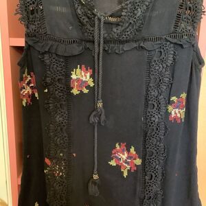 Adorable, lightweight, sleeveless top with tasseled neck tie. Eyelet style details to shoulders and neckline. Cute needlepoint design to fabric. Rayon/polyester/cotton. Size small.