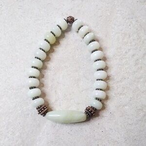 Palest Green Jade Bracelet - Barrel Bead + Rondelles + Copper Spacers 7-7.5"