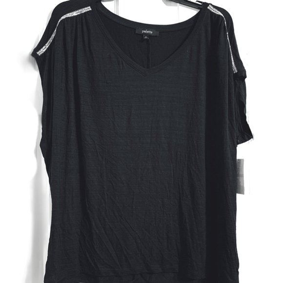 Palette Flocked Stretch Short Sleeve Rhinestone Embellished V Neck Top