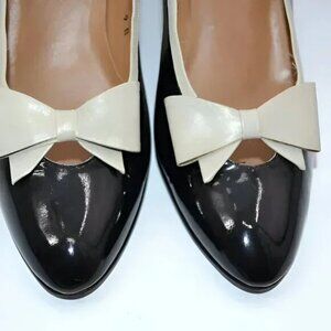 Palizzio Spanish Black Patent Leather Ivory Bow Minimalist Court Pumps Heels 9 B