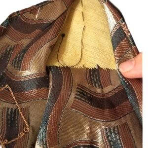 Elegant Palladium Tie featuring a brown, gold, and teal wavy design is breathable perfect for Warner weather. Wear on formal occasions as well as nights out. Excellent feminine tie and can be worn in different positions as a scarf.