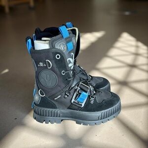 Stylish black winter boots with blue accents. Features unique white designs on the front.