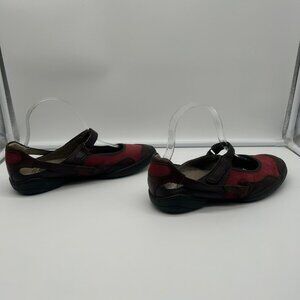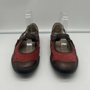 These Palladium Mary Jane comfort shoes for women are a size 7 in red and brown. They're made from suede leather and feature adjustable hook loop straps and a cushioned sole for ultimate comfort.