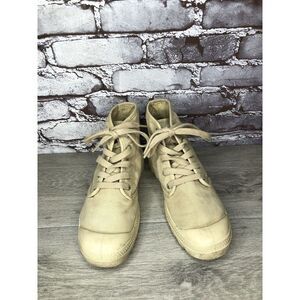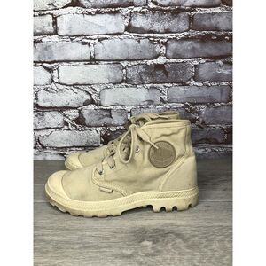 Selling Palladium Pampa Hi Sahara Beige Khaki Canvas Fabric Lace Up Boots Women’s sz 8M US/39EU