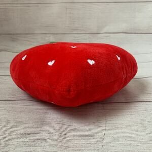 Red heart-shaped strawberry plush dog toy by Pally Paws. This toy has soft green leaves with crinkle material in them and small white embroided hearts. The toy has a squeaker in the middle. It is NEW, with tags. Some tear on the back of the tag.