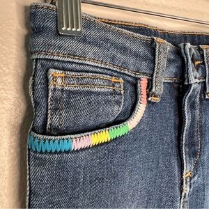 Stylish blue denim jeans with colorful pocket accents. Perfect for casual outings.