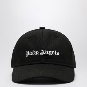 Black cotton Palm Angels hat with embroidered logo on the front and adjustable size via Velcro on the back.