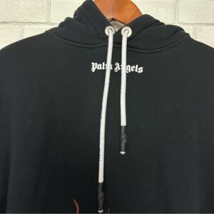 Palm Angels oversized hooded black sweatshirt with orange and red flame printed trims.