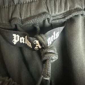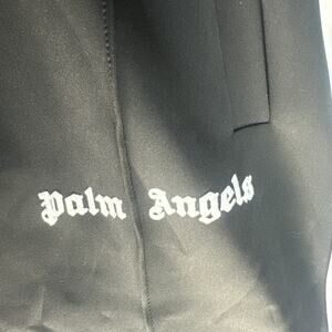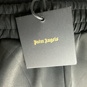 The Palm Angels Men's Shorts in size Large are a stylish and comfortable option for casual wear during the summer season. Made from a blend of polyester and cotton sweat fabric, these shorts feature a classic tie closure, mid-rise fit, and 8-inch inseam. They also include convenient slash pockets and a flat front design with a regular fit. Perfect for adding a touch of angelic flair to your wardrobe, these black shorts are machine washable for easy care and maintenance.