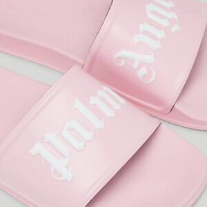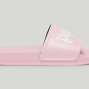 Stylish pink slide sandals. Features bold branding. Comfortable and trendy.