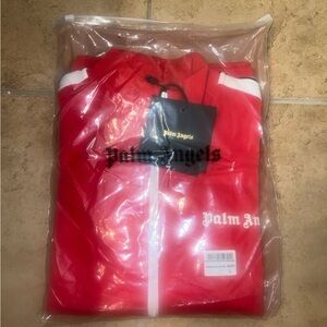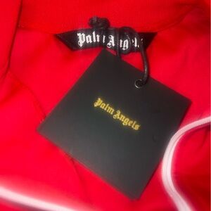 Bold red bomber jacket with sleek white stripes. Features Palm Angels branding. Perfect for a modern, sporty look.