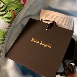 Palm Tree print with blue background logo-appliqué bucket hat from PALM ANGELS featuring appliqué logo, tonal stitching and flat brim.