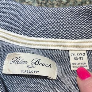 EUC excellent used condition. Deep Cove Blue and white 3 button golf shirt/polo shirt. Palm Beach 1922 Classic Fit size 2XL 50-52. Short sleeve, slits on sides, extra button. 80% cotton 20% polyester.