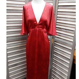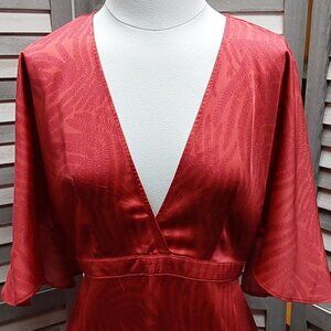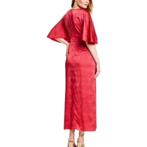This Palm Leaf Contrast-Print Exaggerated Flutter-Sleeve Maxi Dress from Fe Noel x Target brings effortless style & charm to your wardrobe. Adorned with allover palm leaf contrast print, this fuchsia dress is designed with a splice V-neckline, short exaggerated flutter sleeves, and a shapely waistline with front and back darts. It's made from soft, midweight fabric with a maxi length and a zipper fastening across the back.