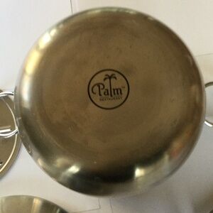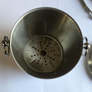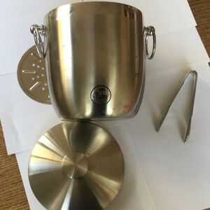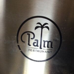 Palm Restaurant Ice Bucket with Top and tongs. With top, it’s 9” tall by 7” wide.