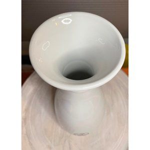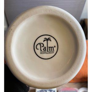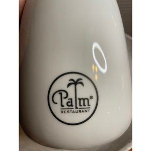 Description: White ceramic wine or juice carafe/pitcher from Palm Restaurant. Black Palm Tree logo on crisp white ceramic glaze. No chips, cracks or crazing. 10.5" Tall. Holds approx 1 liter.