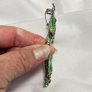 Stylish green palm tree brooch with amber rhinestones. Perfect for adding a tropical touch to any outfit.