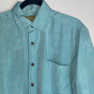 - teal / seafoam green short sleeve button up with a palm tree pattern (the pattern is light but it is present)