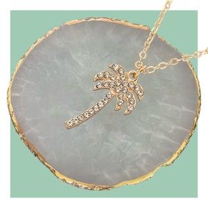 This palm tree necklace with gold plated rhinestone pendant and cable chain looks great with any outfit on its own and even better layered with other necklaces for many more fashionable possibilities. Effortlessly elevate your wardrobe with this enchanting necklace with tropical vibes. Embrace the allure of paradise and add a touch of beachy elegance to your jewelry collection with this gold plated rhinestone palm tree necklace.