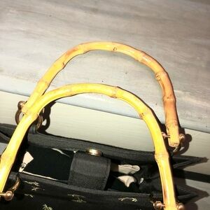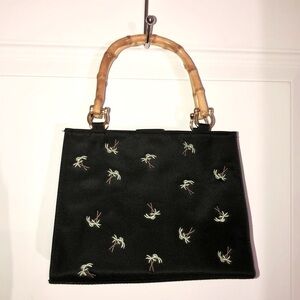 Black purse with little green and brown palm trees embroidered on it and bamboo handles