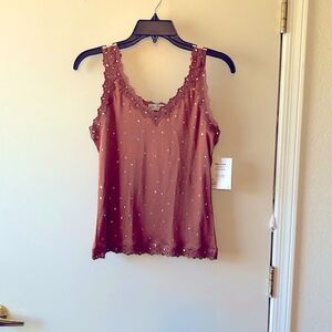 Palm Dream Tank Top Size S Med Brown NWT Hand Crafted Silk blend tank with Lace trim.