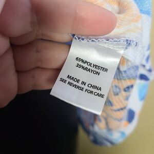 This is a long sleeved top by Palm Grove. It is white with yellow and blue floral print. This top is ribbed and has an open panel on the chest as shown in the photos.