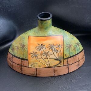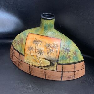 PalmTree Ceramic Vase Hand painted Gold Flaked Green Brown 13 X 8 1/2 Inch Tall