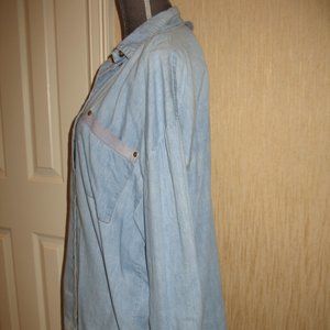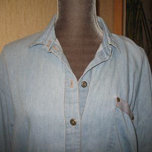 Here is a very nice Palmer e Palmer LIght Blue Shirt in Size Medium - Metal Buttons down the front and one button on each cuff - Snap trim on the left pocket - There is also a tab on the back under the collar with another snap - This has been my personal shirt