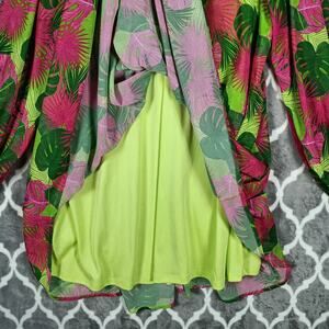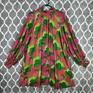Palms Away Dress Womens Large Pink Green Tropical Palm Long Sleeve Resort