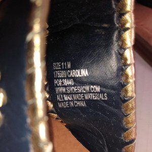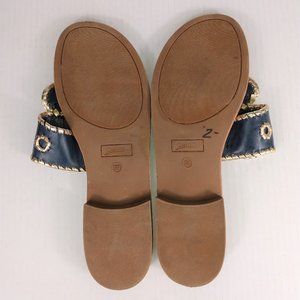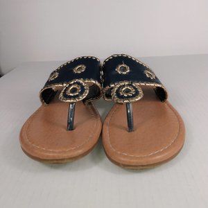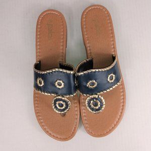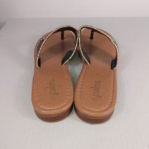 Used excellent condition. Palms Navy and Gold thong slip-on sandals with cushioned comfort insoles and flexible traction outsoles that provide a comfy wear. Synthetic uppers.