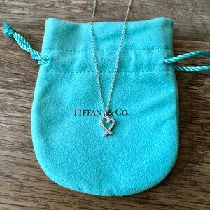 Paloma Picasso's unique interpretation of the iconic symbol for love. Pendant in 18k white gold with round brilliant diamonds. On a 16" chain. Excellent pre-owned condition. comes with blue Tiffany & Co. pouch and black Tiffany & Co. box. Original price $3450.