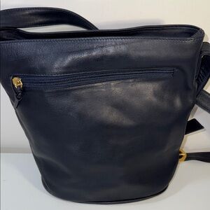 Made in Italy - this navy leather Paloma Picasso handbag is a super versatile bag. Gold insignia in front - zipper Claire, adjustable strap. Zipper pockets inside and outside. Measures 11.5 by 10 by 5.