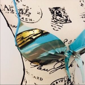 Stylish and flattering bikini top featuring a vibrant blue tone with elegant gold accents. Push-up design provides lift while adjustable straps and back clasp offer a secure, customizable fit. Perfect for beach days, poolside lounging, or resort vacations.