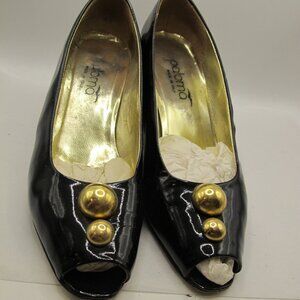 Paloma black patent leather peep-toe 2 inch heel with gold button accent 8.5AA