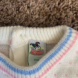 This is a Vintage Girls Sweater Skirt Set , probably from the 80s-90s. It is made by Palomino in a size 104, which is usually a 5-6. Overall look and cons is still nice. A Unique set.
