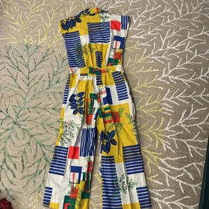 This jumpsuit is new without tags. It has a side, zipper and pockets. The chest is 32 inches. The waist is 28 inches. The rise is 11 1/2 inches. The inseam is 22 inches.