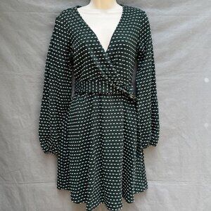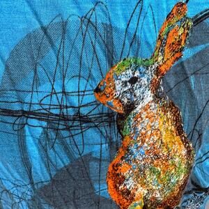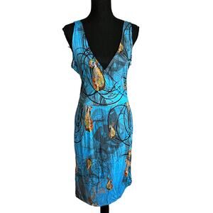 Pam & Arch London Blue Rabbit Blouson Jersey Dress LARGE Deep V Whimsical Unique Ruched NEW