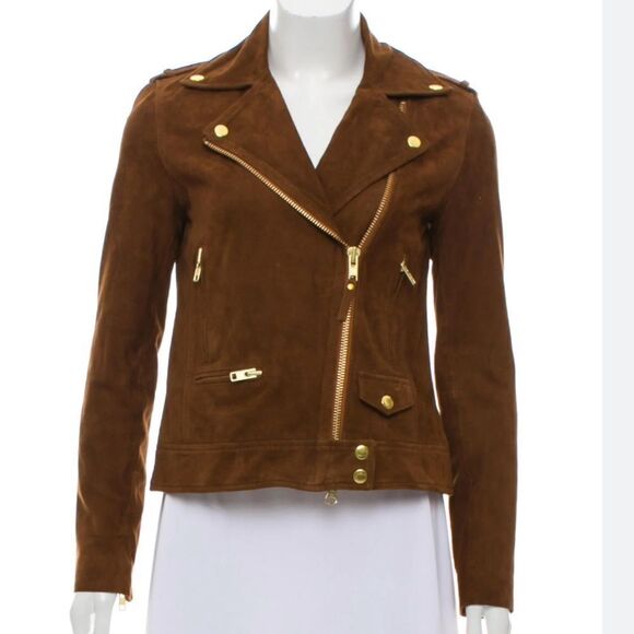 Brown Pam & Gela suede bomber jacket with gold-tone hardware and snap closures throughout, dual epaulets at shoulders, four pockets at front, zipper accents at cuffs, lace-up accents at back and asymmetrical exposed zip closure at front.