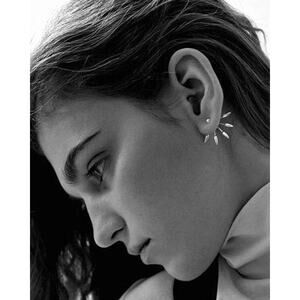 Five spikes radiate behind the ear held into place by a pyramid stud.